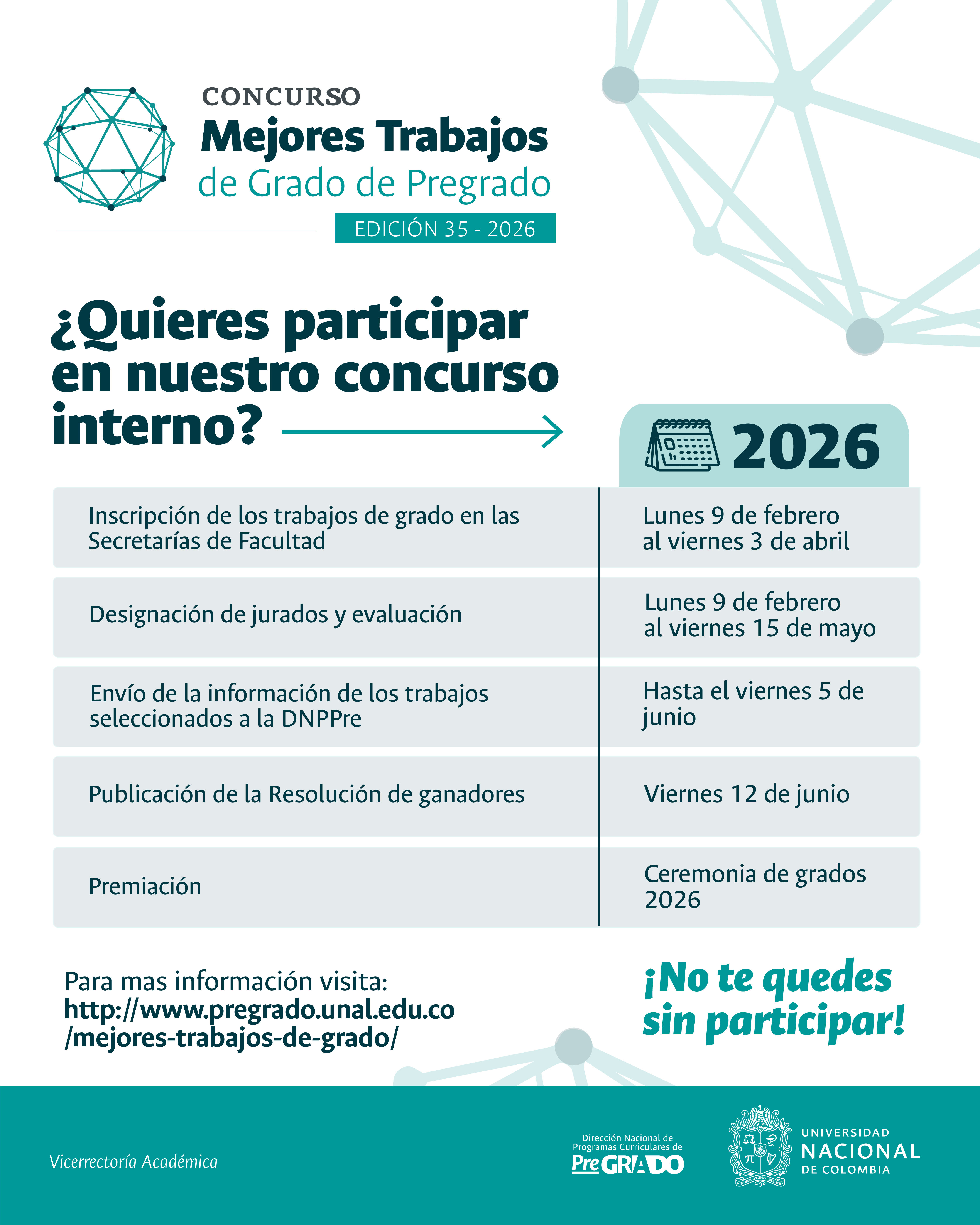 Con el fin de estimular y promover el reconocimiento a la excelencia académica, y a la vez auspiciar la conformación de comunidades académicas y compartir con la sociedad el resultado de las acciones emprendidas por la Universidad. Anualmente se realiza la convocatoria para participar en el Concurso Mejores Trabajos de Grado de Pregrado, reglamentado en el Acuerdo 70 de 2009 del Consejo Académico (Artículos 18-21). La iniciativa de crear un Concurso que permitiera incentivar la investigación en los estudiantes de pregado fue liderada por la Vicerrectoría de Bienestar Universitario en 1990.